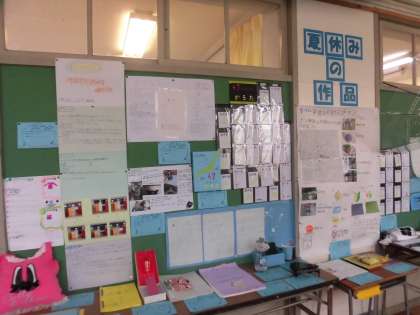 42日間の夏休みが終わり2学期がはじまって4日目を迎えました。すっかり日常の学校風景に戻った池之上小学校。子供たちの活躍がたくさん見られます。さて、夏休み42日間、子供たちは様々な場でたくさんの努力を重ねたことでしょう。その成果の一つが夏休みの作品の数々です。実験や観察、旅行記、絵本作り、工作・・・子供たちの得意分野であったり興味関心の高い分野であったりと、ほんとうにたくさんのすてきな作品が教室や廊下に飾られました。一つ一つの作品を見ていると、感心させられるばかりです。みんながんばりました。
