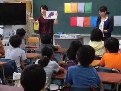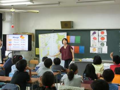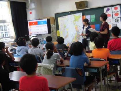 5年生の外国語活動の授業の様子です。ICTで教材を提示することで視覚的教材の効果的な活用を図りました。英語を聞いたり話したりする内容も、社会科との学習のつながりを意識しました。今日は果物の生産地を取り上げました。子供たちは知識をつなぎ合わせ、知的好奇心を高めていきます。今日の授業は担任と富士の学び舎内の多聞小学校の教員二人で指導しました。実際の果物ジュースも登場して子供たちの「英語をしっかり聞こう、聞いた内容を自分で考えてみよう」といった学習意欲が高まりました。