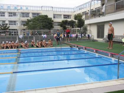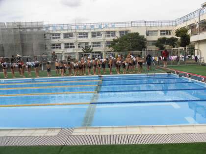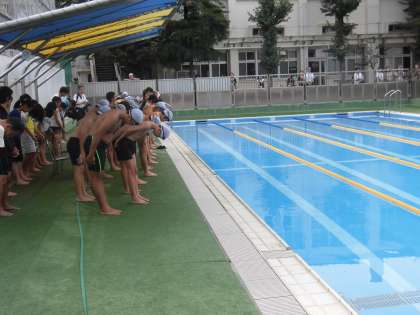 水泳記録会の閉会式とプールおさめを同時に行いました。「全力で安全に楽しく水泳に取り組めた」「合格まで何度も挑戦しレベルアップできた」と代表の子供が水泳指導を振り返りました。その言葉の通り、みんなほんとうによくがんばりました。友達を応援し、自分の記録に挑戦する子供たちの姿がいっぱいありました。子供たちのすばらしさにたくさん触れることのできた水泳記録会になりました。最後にプールに向かってしっかり礼をして、平成29年度高学年の水泳の授業が閉じられました。