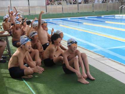 なんといっても池之上小学校の高学年のすばらしさは、友達を応援する心と態度です。プールサイドでは大きな声援が繰り広げられました。スタート前は緊張感みなぎる静の応援、競技中は元気であたたかな声援・・・子供たちがつくり出すすてきな水泳記録会になりました。