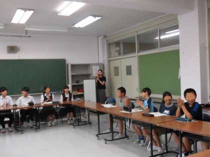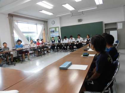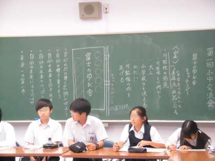 9月12日、富士の学び舎の取組として、児童・生徒会活動が行われました。富士中学校生徒会と池之上小学校・代沢小学校・多聞小学校代表児童の交流です。23名が集まりました。第1回交流会は、中学校生徒会からの提案でした。富士の学び舎の「登り旗」と富士の学び舎「キャッチフレーズ」を作ることになったのです。中学校生徒会の皆さんが一生懸命に考えた案が「可能性の発見」・・・ですが小学生には難しいのではないかという意見も出され、小学生と共に考えたいという願いからこの時間が設定されました。「可能性の発見」には生徒たちの熱い願いが込められていました。本校卒業生でもある中3の生徒からその説明がありました。「これから生きていく中で、自分ができることを見つけることが大切だと考えました。可能性の発見です。小学校・中学校は通過点に過ぎません。今はできることが少なくても、大人になってできることを増やしていくために、今、自分の可能性を発見することが大切です。例え、小学校・中学校の時に輝いていなくても、小中学校は大人になるための準備。大人になったときに武器になる何かを見つける時期です。絵を描くことかもしれません。歌を歌うことかもしれません。自分の特技を見つけること、自分の好きなことを見つけることが大切です。そんな願いを伝えたいと「可能性の発見」を考えました。この思いを小学生にも伝えたいと思っています。すてきなキャッチフレーズを一緒に考えてください。」