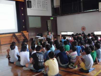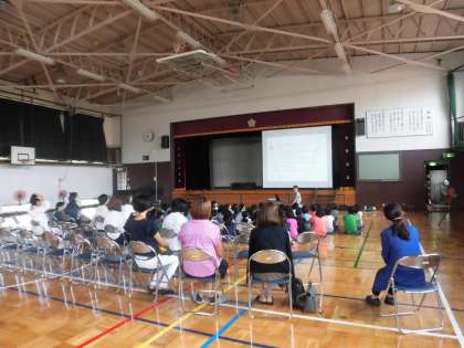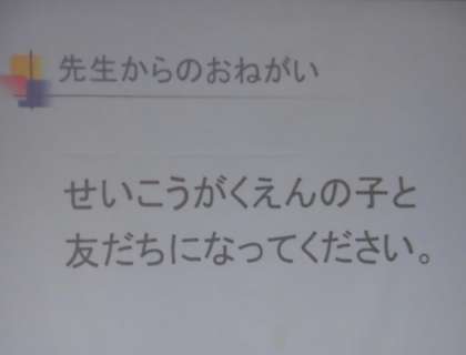 青光学園の先生から青光学園のたくさんのことをお話いただきました。「一緒に遊ぼう!」「交流しよう!」をいう二つの大切な言葉とサインも教えていただき、子供たちは先生のお手本を見ながら実際に手を動かしてみました。これから始まる交流で、互いに交流し合い、心を通い合わせながら、楽しいひとときを送ることができるよう互いの学校での準備活動が始まります。保護者の皆様も授業に参加していただきました。ありがとうございました。