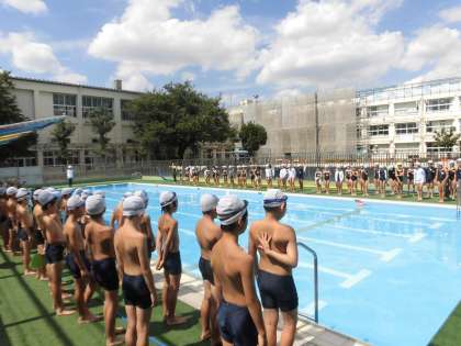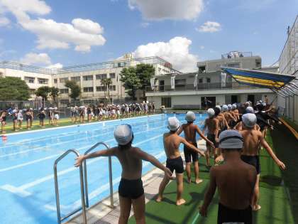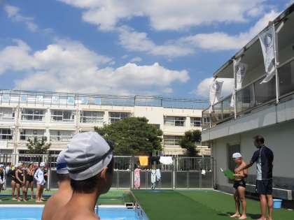 9月13日、3・4年生のプールおさめの会を行いました。プール開きは雨で体育館で行いましたが、最後の日は秋晴れの晴天に恵まれました。今年度最後の水泳を存分に楽しみました。授業の最後に行われたプールおさめの会では、3年生と4年生の代表の子供たちが今年度の水泳を振り返り発表しました。「苦手だった水泳。練習がいやだなと思うこともありましたがあきらめずに練習を続けました。」「あまり得意でない水泳でしたが、一生懸命に練習をすることで上達しました。」「進級するために夏のプールにもたくさん参加しました。」「友達の応援が力になりました。」と力強く発表しました。二人とも自分のがんばりをしっかり見つめて振り返り、来年度の抱負につなげていました。3・4年生の一人一人が心の中で自分のがんばりをかみしたことでしょう。最後にプールに向かってみんなでがんばれたこと、安全に学習に臨めたことへの感謝を込めて「ありがとうございました」を大きな声であいさつしました。みんながんばりました。