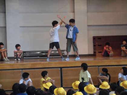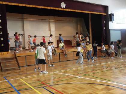 9月17日、音楽朝会が行われました。今月は音楽委員会とダンス・ミュージッククラブの子供たちが企画・運営しました。音楽に合わせて思い切り身体表現する内容です。最初に、音楽委員会とダンス・ミュージッククラブの子供たちがみんなの前で見本を見せてくれました。堂々と踊っています。お手本を見ながら多くの子供たちがすぐにダンスを覚えました。会の終了時には、行進して帰る子供たちをダンスしながら見送りました。みんなでつくりあげた音楽朝会になりました。