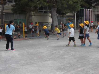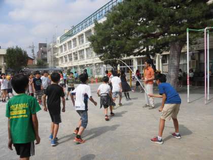 10月に行われる「ながなわ大会」に向けて、各学級では、ながなわの練習が始まりました。先生も校庭に出て子供たちを応援しています。ながなわは、一人一人の技もとても大切ですが、それにも増して、練習してよりよく飛べるようになりたいという気持ちと、クラス全員で記録を更新していくんだというチームワークを大切にする心が必要です。失敗しても励まし合い、声を掛け合い・・・そんなあたたかな心が集まってこそ生まれる団結力を子供たちはきっと高めてくれることでしょう。「はい! はい! はい!」という大きな声と「がんばれ! がんばれ!」という声援が校庭からたくさん聞こえてきます。