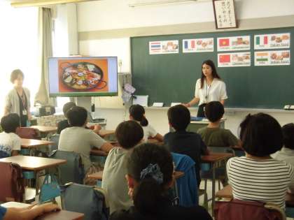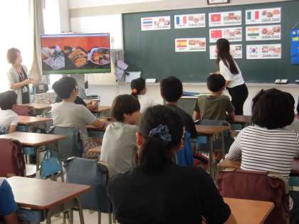 6年生の外国語活動の様子です。「世界の文化や自然、日本のよさに気づく。」「英語を意欲的に聞き、自分の言葉で伝えようとする。」「国名や時刻、大きな数の言い方に慣れ親しむ。」ことを単元目標に、今日の授業が組み立てられました。子供たちが身近に感じることができるようにと、池之上小学校の周りの世界のレストランなどを教材にしました。池之上小学校の周りから学ぶ「世界」・・・子供たちは、身近な地域から英語に触れ、言葉(英語)のキャッチボールを楽しむことができました。