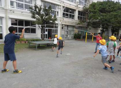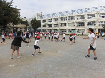 今週から「ながなわタイム」がはじまっています。中休みの終盤の5分間を「ながなわタイム」として全校で取り組む活動です。ながなわタイムには、3つの目標があります。第1は「リズム感と体力向上」 第2は「目標に向かってみんなでがんばることで学級の絆を高めること」 第3は「互いに励まし合い声をかけ合うこと」です。どのクラスも目標に向かって、互いに声をかけ合い練習に励んでいます。今日は低学年の様子を紹介します。1年生です。6年生がやさしく手伝います。練習の最後には1年生からのお礼の言葉がありました。