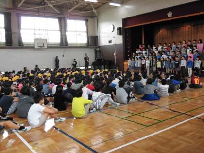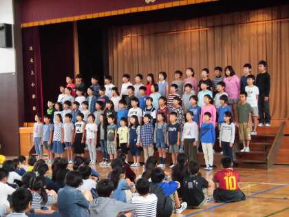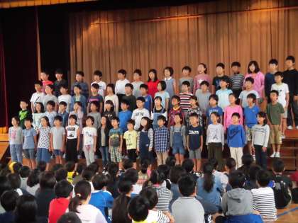 10月5日、9月の「すくすくタイム」の取り組み発表として、4年生の子供たちが歌「ありがとう」と詩「一秒の言葉」を披露しました。これまでの練習の成果を精いっぱい発揮する真剣な子供たちの姿に感動しました。言葉の重みと大切さが、聞く人の心をあたたかくします。すてきな発表会になりました。