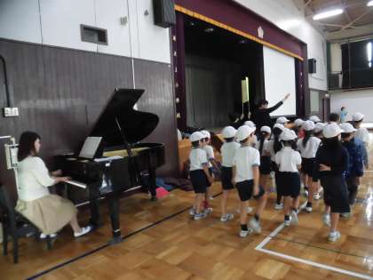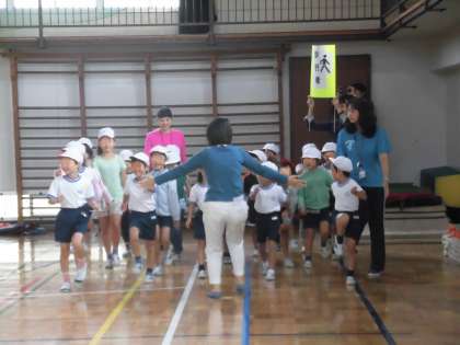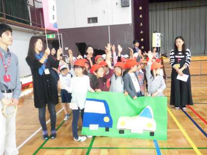 「判断力」を身につけるために、実際の場面を想定して「くるま」の役と「歩行者」の役を子供たち自身が体験しました。この日の交通安全教室には、ピアニストの先生もご参加いただきました。すてきなピアノの演奏に合わせて、歩行者が同じスピードで道路を横断していきます。そこへ「くるま」役の子供たちがやってきます。「くるま」は速いスピードとゆっくりのスピードに変化しながら走ります。同じ車でもゆっくり走っていると衝突を避けられる状況にあっても、速く走ってくると歩行者と衝突してしまいます。こうした状況を子供たちが理解し、正しい行動ができることを目指しました。