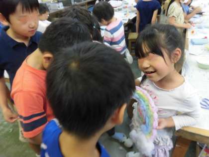 すてきな作品ができあがりました。友達の作品を「すてきだね」「いいね」と鑑賞し合う子供たち、互いを認め合う心の育ちを感じました。