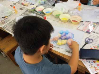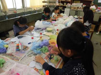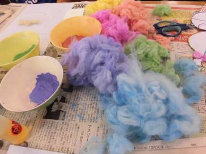 いろいろな色の綿がふんわりとできあがりました。チョークからこんなにもすてきな綿になることに感動しました。このカラフルな綿を使って作品作りに励みました。