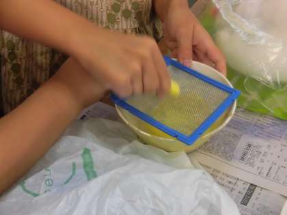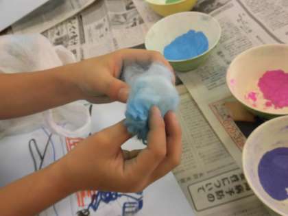 チョークの素材を生かした活動を行いました。子供たちは、自分の作品に使いたい色のチョークを選び、削っていきます。削った粉を綿に含ませしっかりともんでいくと色とりどりの綿ができあがります。例えばピンクと青を混ぜると紫に変化する・・・調色の不思議さも学ぶことができました。
