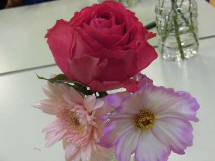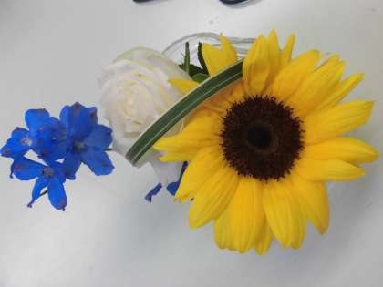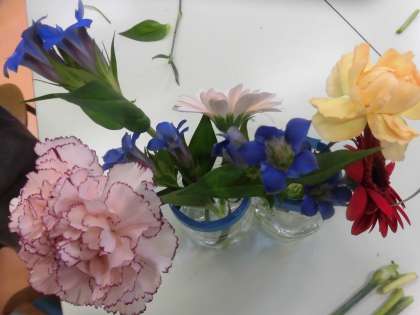 子供たちが生けた作品です。自分の好きな色の花を選んだ子、家族を思い大好きな人の好きな花や色を選んだ子、高さを意識した子、広がりを意識した子、様々な思いが込められました。今日、家に持ち帰る予定です。ご家庭でもお花の命を大切に、しっかりお世話にしてほしいと願っています。