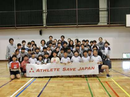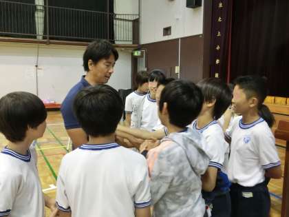 AEDの授業が終わると、6年生たちは飯沼選手のまわりに自然と集まりました。飯沼選手の鍛えられた体に感動したり、授業の感想を伝えたり、子供たちらしいコミュニケーションの時間が生まれました。みんなで記念の写真も撮らせていただきました。みんなの笑顔が広がりました。