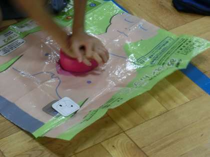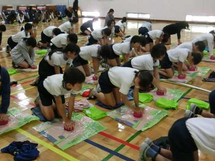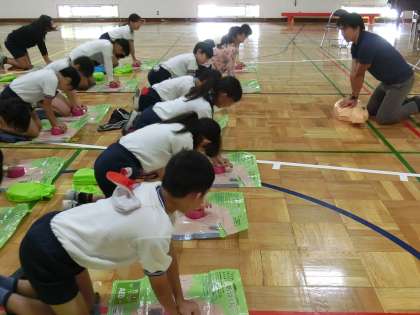 お借りしたAEDキットを使って、子供たちが心臓マッサージの練習をしました。手にかかる力の大きさや腕をまっすぐに伸ばす大変さを実感しました。