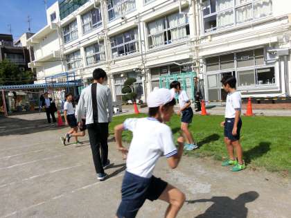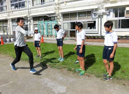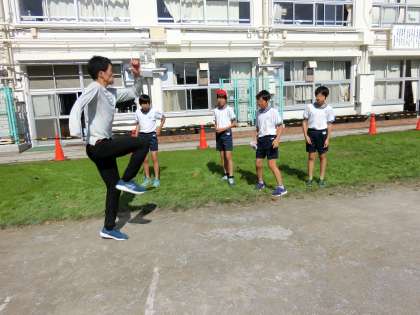 25日に行われる連合運動会の種目である「走り幅跳び」について、子供たちが遠くに跳ぶためにはどうしたらいいのかアドバイスを求めて芦田創選手に声をかけました。子供たちの熱い思いに応えて、ていねいに走り幅跳びのポイント教えてくださった芦田創選手。フォームについてのご指導を生かして連合運動会でがんばります。