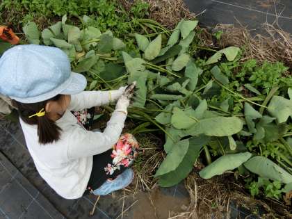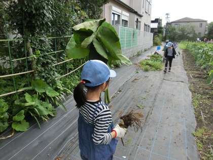 土の上に残った緑の葉や茎は、みんなで協力して全て葉っぱコーナーに運びました。サトイモが収穫されるまで太陽のエネルギーをいっぱい吸収していた葉っぱたち。役割が終わりました。でも3年生の子供たちはちゃんと気づいていました。葉っぱは土になって栄養に代わり、次に生まれるサトイモたちの栄養になることを。自然の恵みやこれまで育ててくださった農家の方にしっかりお礼を伝え、さといもほりの活動が終わりました。