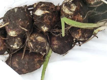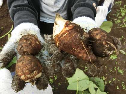 「先生、見て、収穫できたよ。」と、あちらこちらから声が上がりました。親芋をじっくり観察する子もたくさんいました。