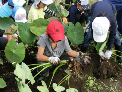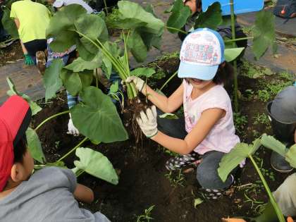 一生懸命に掘っていくと、サトイモたちが顔を出しました。友達と収穫を喜び合ったっり、互いのサトイモを見せ合ったりしている子供たち。みんなうれしそうでした。