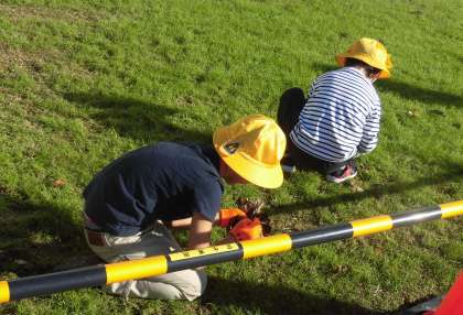 低学年の子供たちも一生懸命に落ち葉を拾いました。プランターや芝生まで心を配る子供たちの姿もありました。みんなで協力して取り組むと、あっという間にたくさんの葉っぱを集めることができます。