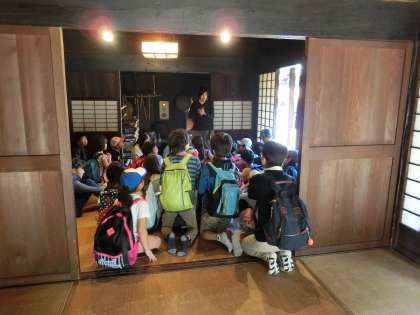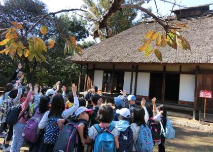 3ヶ所目の見学場所は、次大夫堀公園です。江戸の民家や生活を再現している公園の中で、いろいろなことを教えていただきました。農家の一般的な家には部屋が4つあることが多いことや、その4つの部屋は田んぼの「田」の字のように並んでいることなど、新しい発見でいっぱいでした。自然の豊かさにも驚きました。鳥が美しい声で鳴いていてその声に耳を傾けました。