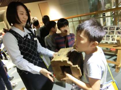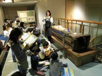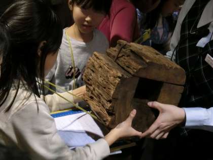 木でできた水道管を観察しました。一部分でしたか水道管に実際に触れることもできました。ずしりと重い水道管にみんな驚いていました。