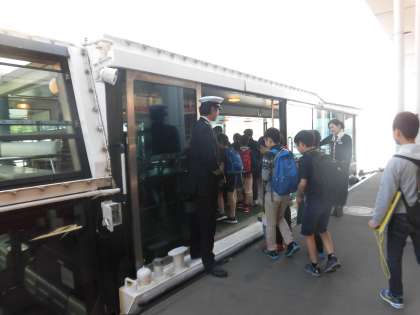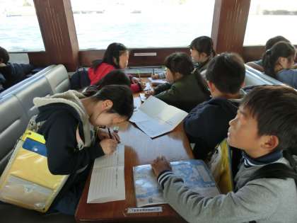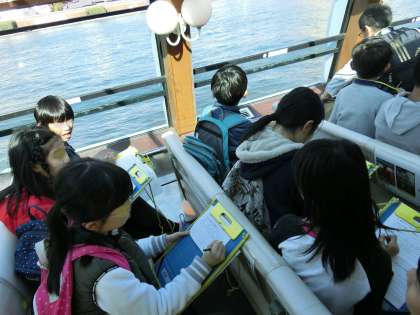 最初に隅田川を水上バスで渡りました。水上バスに乗り込むと、しおりに気が付いたことをメモしはじめた子供たち。学びの姿勢がとても立派でした。川にかかる橋の数を数えながら、隅田川から見える東京の町の様子を観察しました。40分間を楽しみました。