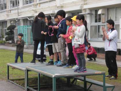 みんなが今よりもっと仲良くなるために集会委員会の5・6年生が企画・進行しました。ジャンケンに勝ち残った友達にメダルのプレゼントもありました。集会後には反省会、がんばったことを先生と仲間たちで認め合いました。この反省会が次の集会の成功へとつながっていきます。