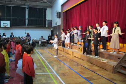 みんなで「幕をあける歌」を元気に大きな声で歌いました。リードするのは音楽委員会の5・6年生です。笑顔がとてもすてきでした。
