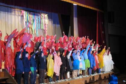 広い海にスイミーとその兄弟たちがいました。海には美しく不思議な生き物たちがたくさんいます。海の世界を見事に表現した2年生。みんなの力を合わせて大きなマグロを追い払うことにも成功しました。池之上小学校の子供たちのチームワークのすばらしさを表しているかのようです。みんなの力を合わせて元気で明るい舞台を創りました。2年生のみなさん、すてきな劇をありがとう。2年生は、学芸会の練習をしながら、「子ども郵便局」のお仕事もしていました。今日の劇をたくさんの皆様に見ていただき、たくさんのお手紙が届きました。このあたたかなお手紙を2年生が届けてくれることでしょう。2年生のみなさんよろしくお願いいたします。