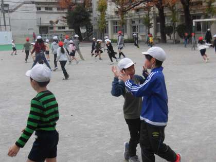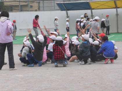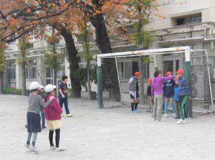 11月のなかよし班活動が行われました。冷たい風にも負けずに元気に校庭で遊ぶ子供たち。各班で考えたゲームをみんなで楽しみました。