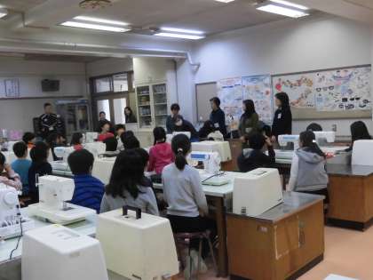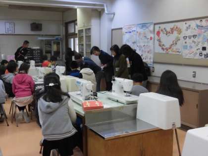 5年生の子供たちが家庭科の時間にミシンを使って袋作りに取りかかりました。このミシンを使った実習は、安全面での配慮も欠かせません。糸かけなどミシンの操作もとても複雑です。時には機械の故障もあります。担任が指導を進める中で、子供たちの活動を保護者の皆様や地域の皆様がサポートしてくださいました。授業の最初に「よろしくお願いします。」のあいさつをていねいに行い、いよいよミシンを使った活動がはじまりました。