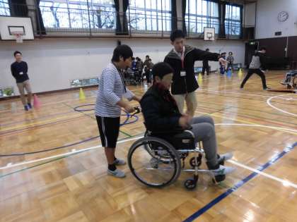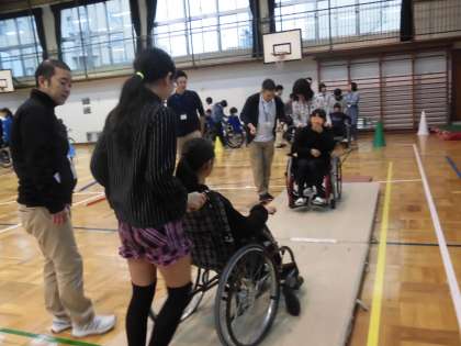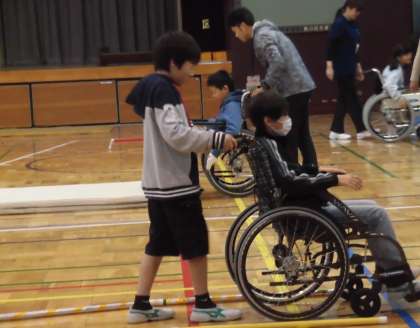 二人一組になり、車いすに乗る体験と車いすを押す体験をしました。どちらの体験も子供たちは少し緊張の様子です。これから様々な人たちと互いを認め合い生きていく子供たちです。同じ仲間として助け合う、努力し合う、そんな関係を築き上げていきたいと思っています。
