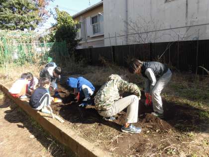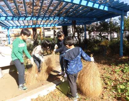 冬のよく晴れた青空が広がる日、ビオトープでの活動がありました。20分休みに自然に関心がある子供たちが今日も集まってきました。ご協力いただいているのは、ビオトープ見守り隊の皆様です。土の中にいる生き物を発見する子供たちや、ほうき草を教えていただき、舞い降りてきた落ち葉を掃く子もいました。木々や枝がほうきとして活躍することを初めて知った子供たち、自然の力に驚くばかりです。