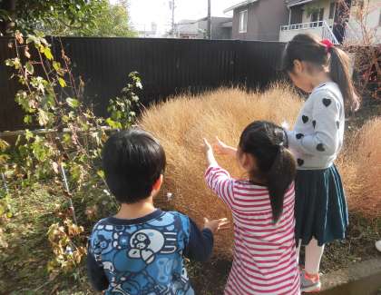 ビオトープ近くのイチョウの木を見上げて、全校朝会でお話した「ちっちゃな木のおはなし」を思い出してくれる子もいました。「もう少しで葉っぱが全部落ちそうだね。春の準備をしているのかな。」もう冬です。ビオトープ周辺の自然の様子も変わりました。それでも子供たちは、藤の実を探したり、オオオナモミや綿を収穫したりしていました。自然の実りに感謝です。