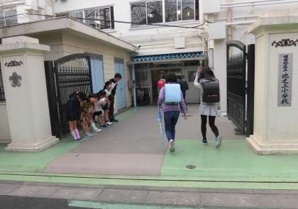 2年生の子供たちが自分たちのことを道徳の時間に振り返りました。先週行われた「あいさつ週間」でのがんばりです。元気なあいさつと礼儀正しいお辞儀ができていたことを認め励ます担任からのメッセージに少しはにかむ子供たち。写真は先週のあいさつ週間の2年生の様子です。