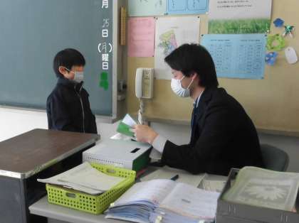 2学期最後に日、担任から一人一人の子供たちに通知表が手渡されました。この2学期にがんばったこと、伸びたこと、これからもっとよさを伸ばしてほしいことなど、子供たちに伝えました。今年の冬休みは、14日間あります。新年を迎える冬休みに、これからの目標をしっかり立て、また新たな自分のよさをたくさん発見してほしいと願っています。