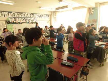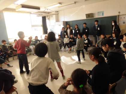 3年生は、アメリカ・イギリス・フィンランド・タイ・インドネシアなどの国について学びました。今年度の交流活動では、池之上小学校の子供たちが主体となってできるものも準備しました。5分程度の短い時間ですが小学生からの発信も大切にしました。3年生は元気に英語の歌を歌ったり、学芸会の再現をしたりと、生き生きと表現する子供たちの姿がありました。
