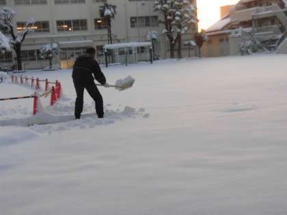 ほんとうにたくさんの雪が積もりました。静まり返った朝の学校では、子供たちが安全に登校できるようにと、教職員が雪かきを行いました。