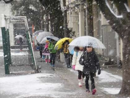 先週に引き続き、雪の日になりました。子供たちが登校する前に教職員で雪かきをしました。子供たちにとって心うきうきする雪の1日を、安全に送れるよう滑りやすいところを中心に整えました。子供たちが学校に着くころ、再び雪がたくさん降ってきましたが、みんなしっかり登校することができました。