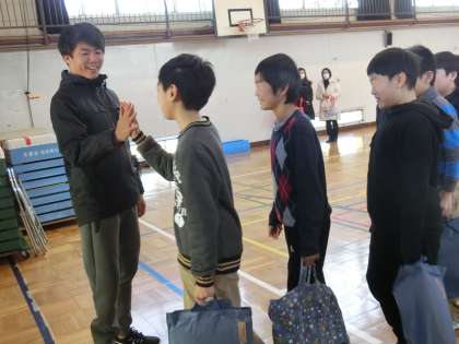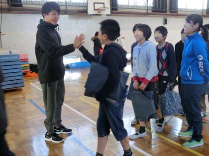 お別れの時間・・・佐藤圭太選手が体育館で子供たちを見送ってくださいました。一人一人とハイタッチを交わします。子供たちは「東京パラリンピックでの活躍を応援しています。」「がんばってください。」「今日はありがとうございました。」など、たくさんの言葉でコミュニケーションしていました。中には、自分の思いを質問という形で表している子もいました。その一つ一つにていねいに答えてくださり、ほんとうにありがとうございました。たくさんのことを学んだ1日。子供たちの心の中に、体験活動と佐藤選手のお話、そして選手としての生き方や前向きさがいっぱいいっぱい残ったことと思います。