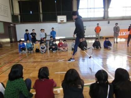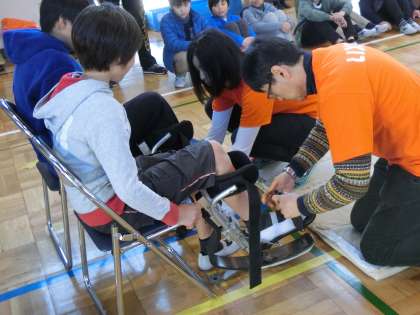 佐藤圭太選手のデモンストレーション。義足を巧みに使い軽やかに、そして速く走る姿を見てみんな驚きました。準備体操を入念に行い、いよいよ子供たちの義足体験がはじまります。