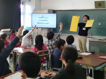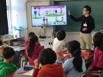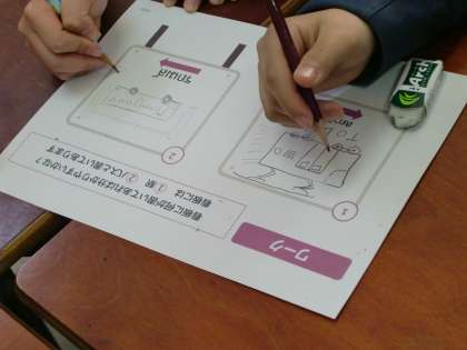 もしも日本が100人の国だったら・・・という問いかけを通して、日本には、あるいは世界には様々な立場の人がいることを知りました。「いろいろな人がいるのが社会です。」と教えていただき、いろいろな人のことを考えながらユニバーサルデザインを学んでいきました。子供たちは、車いすの人にとっては・・・妊婦さんにとっては・・・外国の人にとっては・・・と立場を考えながら自分の考えをまとめました。