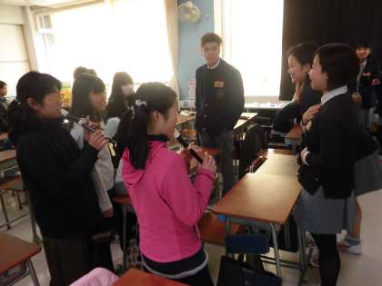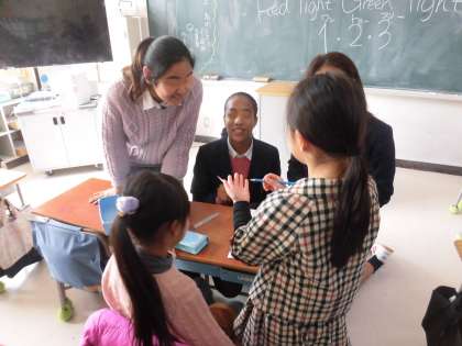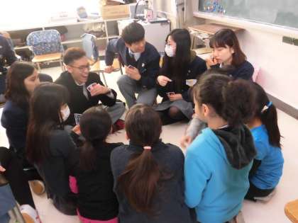授業が終わったあと、高校生と子供たちの交流の場面がたくさんありました。写真は休み時間の様子です。とてもほほえましい和やかな時間でした。保護者の皆様からもご感想をたくさんいただきました。「高校生とのふれあいはとても楽しそうで、学びもありすてきな時間です。」「高校生とのコミュニケーションでは子供たちが楽しそうで見ていて笑顔になりました。」「子供たちがグローバルなことに驚きました。」「高校生もとても工夫してきてくれていたようで、とても充実した内容でした。ほんとうに子供たちがうらやましい限りです。」他にもたくさんのご感想をいただきました。ありがとうございました。