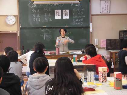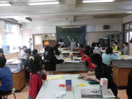 2月15日、5年生が華道体験を行いました。教科「日本語」の学習に「日本の伝統・文化に触れよう」という単元があります。「道」という言葉のつく伝統的な文化や、日本の伝統的な芸術や芸能について考えたり調べたり体験したりする学習です。華道体験はその学習の一環として行いました。いつもお世話になっている、花ボランティアとワンコインクラブの皆様のご協力をいただきました。今日のお花は「ガーベラ」「チューリップ」「忘れな草」「スイトピー」「クッカパラ」です。華道の基本的な部分を教えていただいた後は、子供たちの感性の豊かさの発揮です。