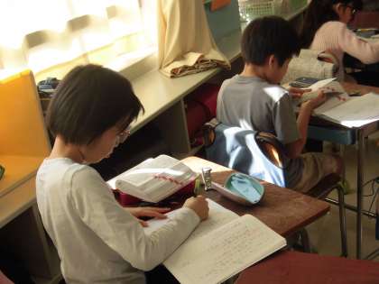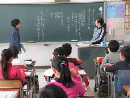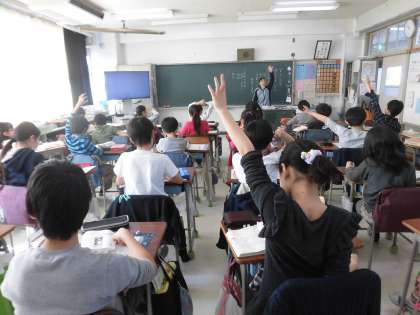 4年生の国語授業の様子です。「漢字の使い分け」という学習。同音異義について辞書を引いて調べ、正しく使った短文を作ったり、進んで発表したりしました。熱心な学習態度が立派でした。