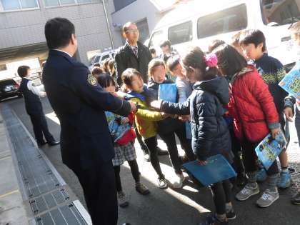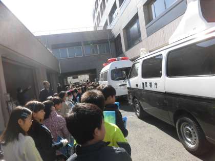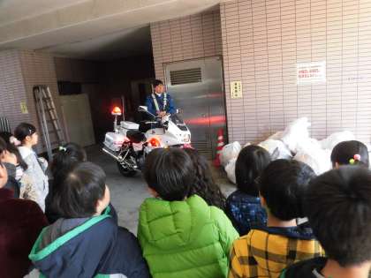 全体でのお話が終わると、中庭で警察車両や白バイの見学をしました。警棒の説明もしていただきました。間近に本物に触れることができたとても貴重な体験になりました。