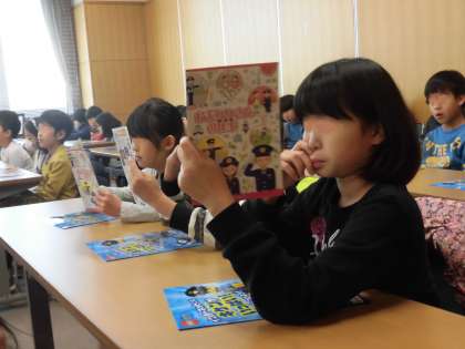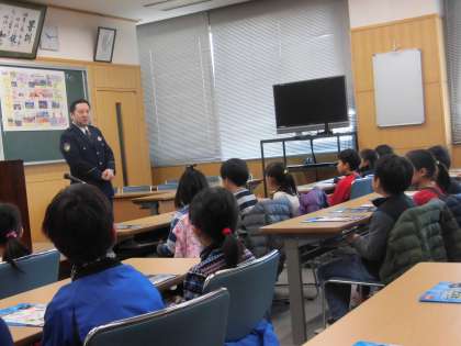 2月20日、3年生が警察署を見学しました。私たちの生活や大切な命を守ってくださる警察の人々の仕事を勉強するためです。交通安全、不審者対応、生活の様々な場で警察官の皆さんが見守ってくださっていることに改めて感謝の気持ちをもちました。今日は、腹話術の上手なおまわりさんが、子供たちに分かりやすくいろいろなことを教えてくださいました。子供たちのリーフレットを見る表情も真剣です。
