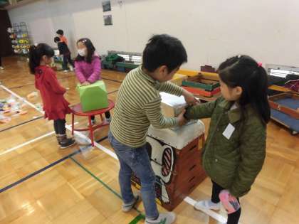 「なかみはなんだ」というコーナーです。とても工夫ある楽しい企画です。幼稚園・保育園生が恐る恐る手を入れます。わかたっときの喜びの表情がとてもかわいかったです。
