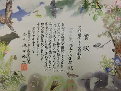 3年生が1年間かけて学習する「ビオトープ」。ビオトープとは、動物や植物が恒常的に生活できるように造成または復元された小規模な生息空間のことを言います。この空間を1年生は整えたり、空間の中に生息する動植物を観察したりしてきました。トンボを中心に生き物には必要な環境があることを学びました。ビオトープ周辺の活動は、3年生以外の子供たちも毎週水曜日に自由にビオトープに訪れ、自然を観察しています。この時間には、これまで長年にわたり池之上小学校のビオトープを守ってくださった地域の皆様やPTAの皆様のご支援・ご協力があります。このビオトープ活動が認められ、全国学校・園庭ビオトープコンクール2017で日本生態系協会賞をいただきました。関係の皆様、ほんとうにありがとうございます。